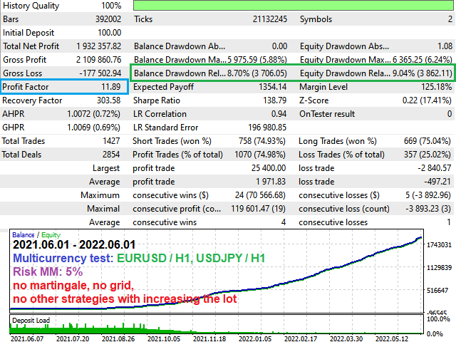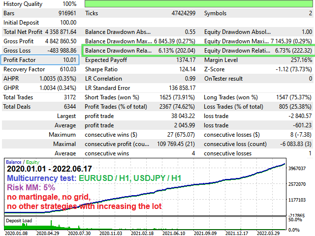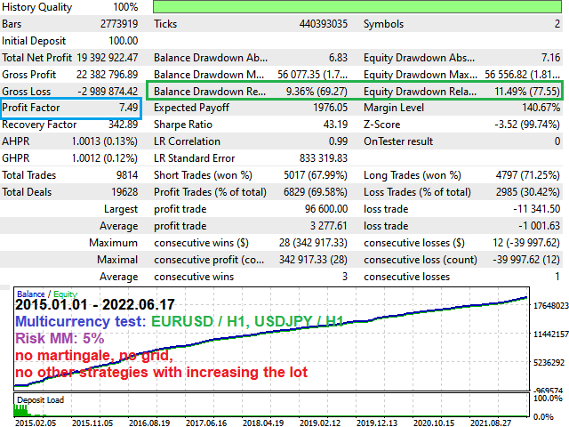 Multi_Currency_BackTestto true to cover both EURUSD and USDJPY in a single run. - Date Range – At least 5 years. The EA was built on real tick data; longer tests highlight robustness.